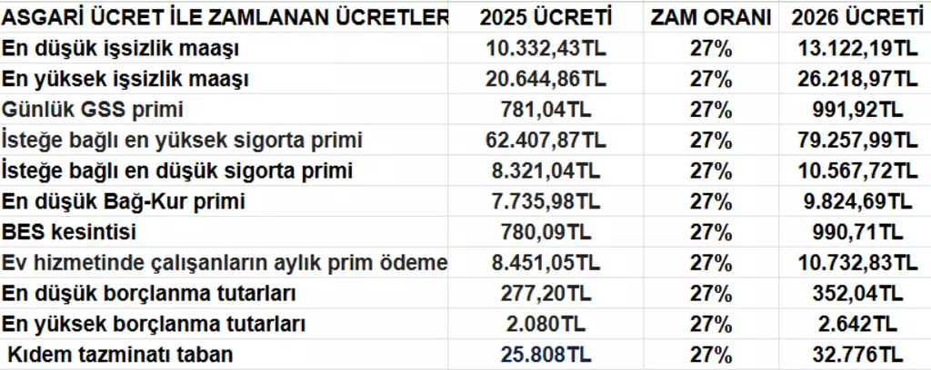 Bu akşam Çalışma ve Sosyal Güvenlik Bakanı Vedat Işıkhan'ın açıkladığı 2026 asgari ücret zammına göre bu kalemlere yüzde 27 zam gelecek.