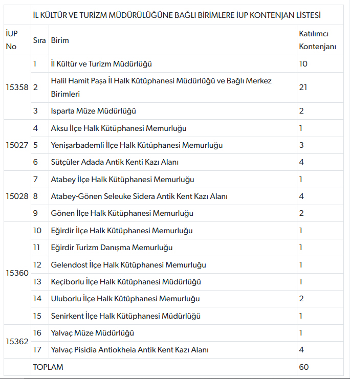 İUP kapsamında katılımcılar; İl Kültür ve Turizm Müdürlüğü, il ve ilçe halk kütüphaneleri, müze müdürlükleri ile antik kent kazı alanlarında görevlendirilecek. Program dahilinde İl Kültür ve Turizm Müdürlüğü’ne 10, Halil Hamit Paşa İl Halk Kütüphanesi ve bağlı birimlerine 21, çeşitli ilçe kütüphaneleri, müzeler ve kazı alanlarına ise farklı sayılarda kontenjan ayrıldı.