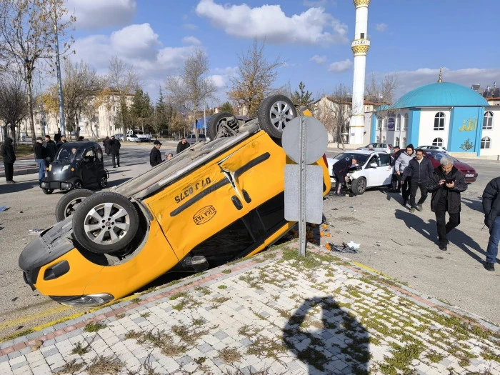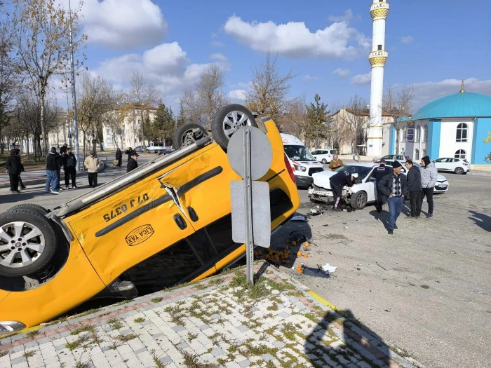 Çarpışmanın etkisiyle ticari taksi ters dönerken kazayı görenlerin ihbarı üzerine olay yerine sağlık ve polis ekipleri sevk edildi.