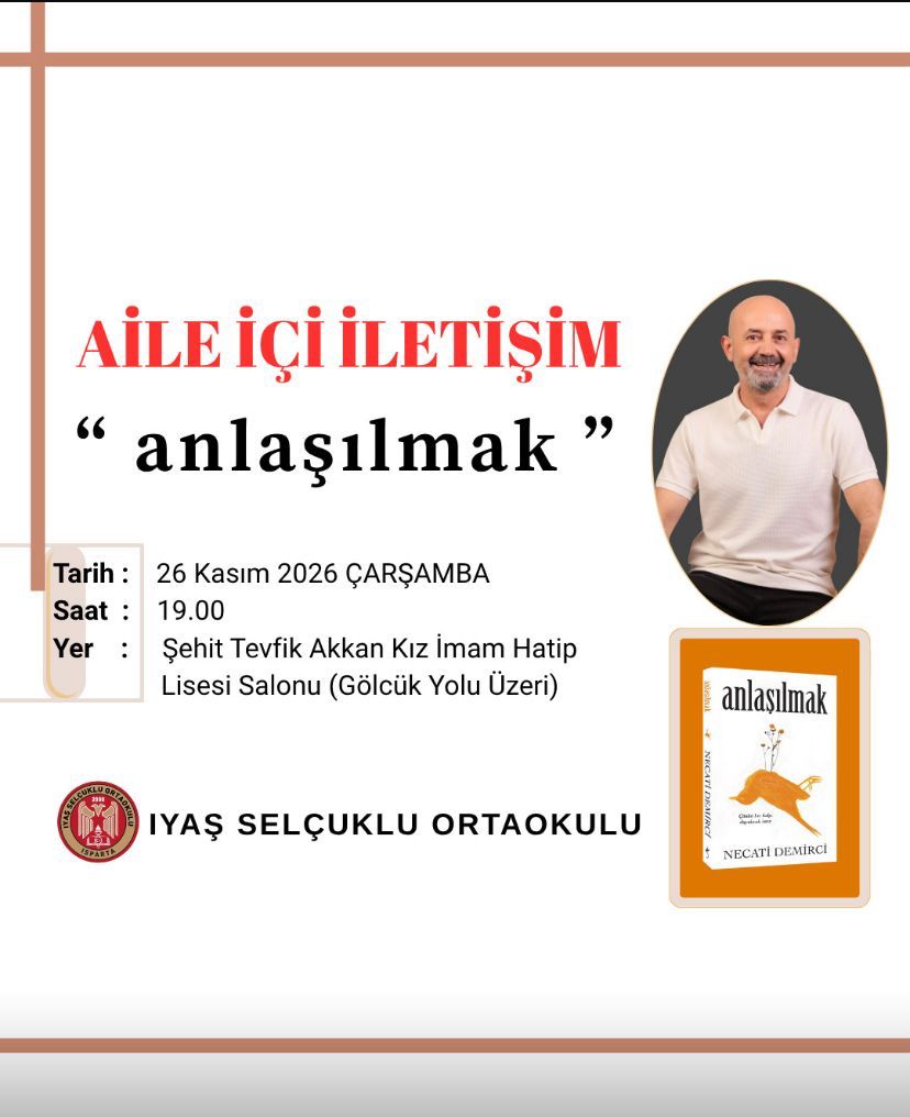 “Aile İçi İletişim anlamak” konulu seminer eğitimci yazar Necati DEMİRCİ tarafından 26 Kasım 2025 Çarşamba akşam Şehit Tevhit Akkan Kız İmam Hatip Lisesi ( Asri Mezarlık üzeri Gölcük yolu) çok amaçlı salonunda düzenlenecek. Seminere sadece anne babalar ücretsiz davetli olup çocuk getirilmemesi rica olunur. Seminere tüm halkımız davetlidir.